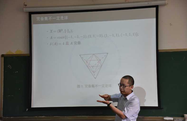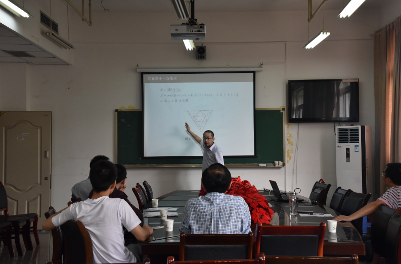 学术报告会上,吴教授首先讲解了范数的定义、距离等预备知识。接着诠释了完备集的定义和性质、完备集与其他集的关系、宽球包和紧球包等相关学术问题。在“完备集和其他集的关系”的报告中指出了完备集的一个特征和赋范线性空间的几个性质,并且在谈到”宽球包和紧球包”时用例子为我们诠释了宽球包和紧球包的定义。此外,吴教授在报告会上还提及了Eggteston完备化、Maehara完备化、Bückner-Moreno-Schneider完备化、Bavaud完备化、Lachand-Roberts&Oudet完备化及其它们的推广,并列举了相关学术未解决的问题。