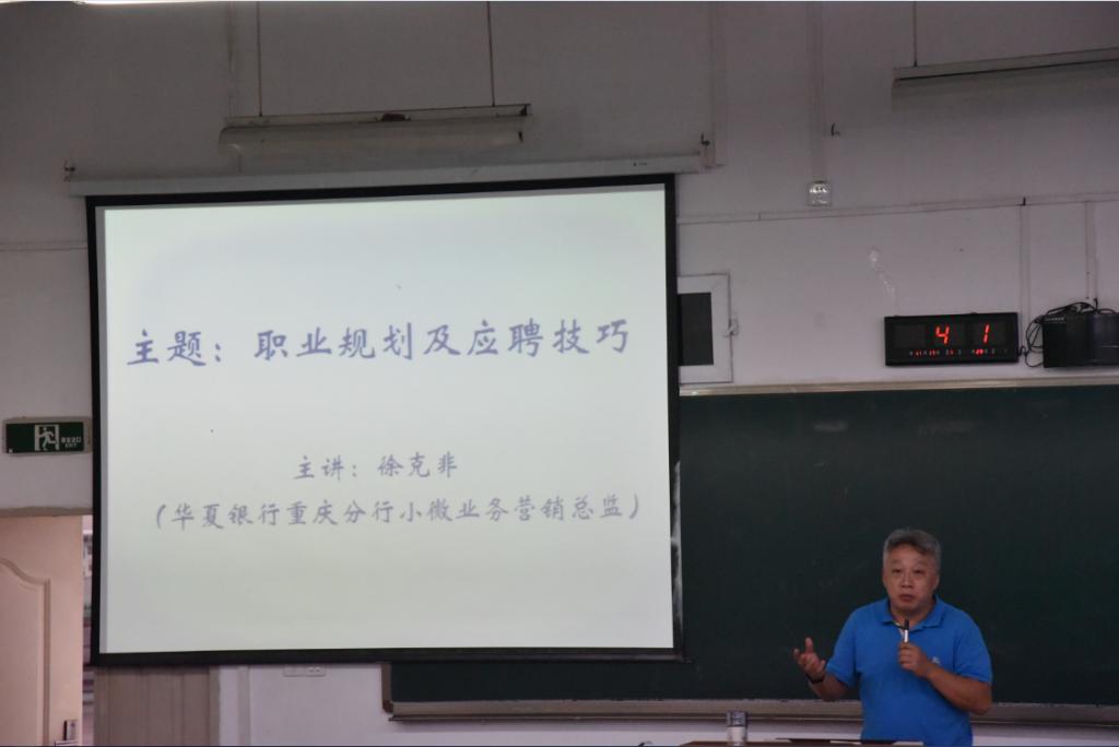 2017年11月17日下午14:30,在慧智楼90309教室,公司1989届数学专业员工、华夏银行重庆分行小微业务营销总监徐克非先生应邀为公司员工作了关于老员工职业规划的讲座。讲座由公司党总支喻书记主持,2014级全体员工参加。