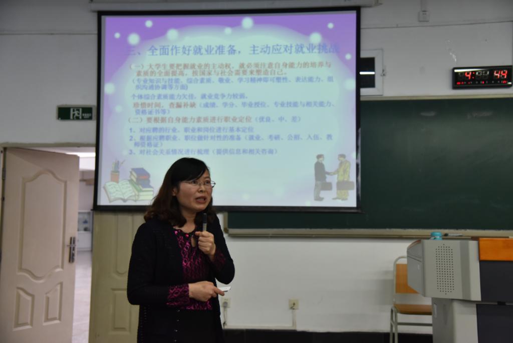 喻书记首先从近四年毕业生人数,2017届毕业生就业市场和形势简析帮助同学们正确地认识就业形势,然后指出当前毕业生还存在定位不足、职业规划意识和能力不足、准备不充分、基层就业观念差等问题,希望同学们能全面做好就业准备,主动应对就业挑战。最后喻书记提醒同学们要注意求职技巧、求职安全。