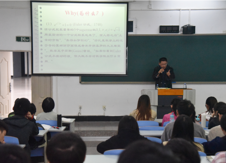 初始,张世清教授从自身经历切入,回忆了70年代本科升学率极低,读书不易的求学情况,张世清教授凭借着不屈的精神和对学习的执着,仅用了四年的时间考上了重庆大学。张教授用自己的经历引出华罗庚的数学学习之路,让同学们了解到这位“中国现代数学之父”对数学的坚持,以及为振兴中国数学而做出的种种贡献。随后张教授为同学们介绍了数学界公认的最美十大定理:欧拉公式、黎曼定理、在三维空间中存在五种正多面体、闭单位圆盘到自身的连续映射至少有一个不动点等价于不存在单位圆盘到单位圆周的单位连续映射、四色猜想等等,张教授为同学们详细的介绍了每一个公理的美丽之处,并鼓励他们要多了解数学历史,以便更加深刻的体会到数学的美丽与学习数学的快乐。最后陈经理为本次会议做总结,呼吁同学们博览群书,多去感受数学的魅力,探索数学的奥秘。
