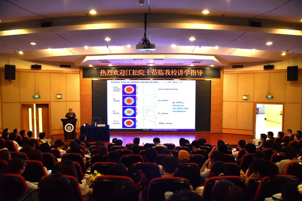 江松院士在博智楼7200学术报告厅为广大师生作了题为《灰色辐射传输方程的正渐进保持滤波PN方法》的学术讲座,讲座由公司党委常委、副董事长柏群主持。江院士介绍了灰色传输方程的物理背景、模型构建和数值求解的难点和最新研究成果,赢得了现场师生的热烈掌声。在讲座的互动环节,江松院士针对现场师生的提问作了详细解答,并就大家关心的一些相关科研问题、团队建设问题进行了交流探讨。