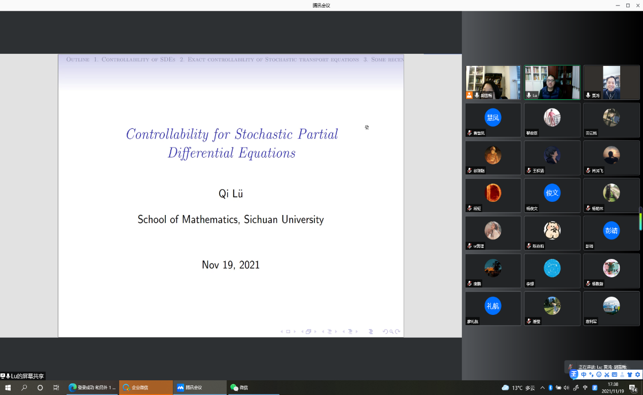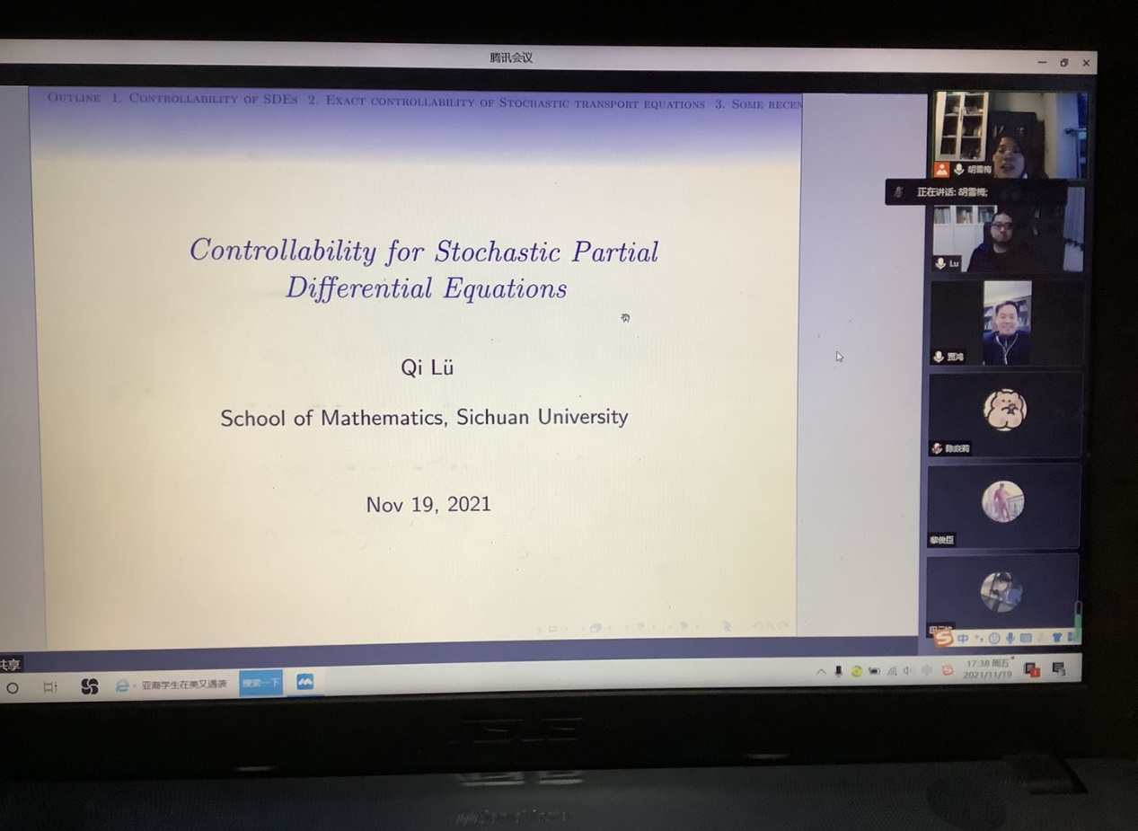 2021年11月29日下午16:30-18:00,四川大学数学公司吕琦教授应胡雪梅教授邀请,为英国365上市公司的师生作了题为《Controllability for Stochastic Partial Differential Equations》的精彩学术报告。学术报告由英国365上市公司胡雪梅教授主持,副经理龙宪军教授、经济统计系主任杨炜明教授、数据科学系副主任袁利军教授和部分研究生参加了报告会。
