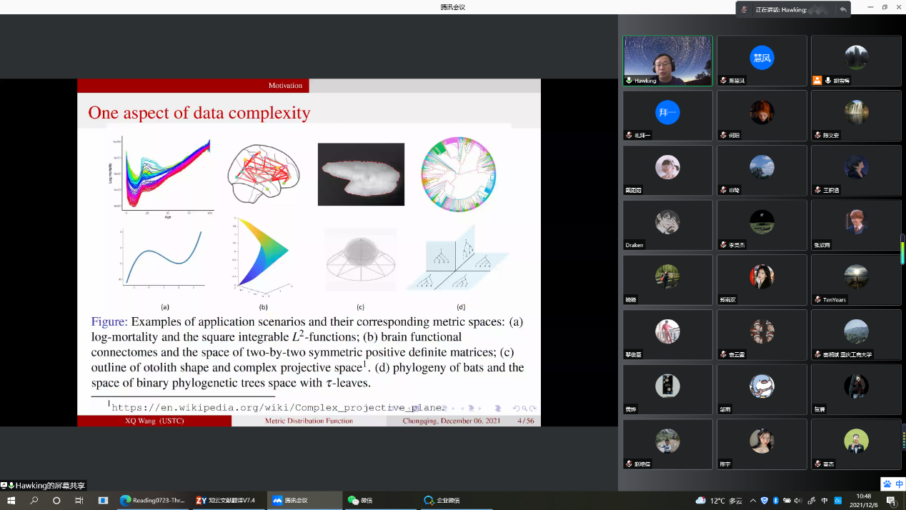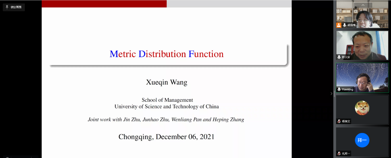 2021年12月6日星期一上午10:30-12:00,中国科学技术大学管理公司王学钦教授应胡雪梅教授邀请,为英国365上市公司数统公司师生作题为《Metric distribution function》的精彩学术报告。学术报告由英国365上市公司胡雪梅教授主持,经理陈义安教授致欢迎辞,数据科学系陈明镜、秦湘斌等骨干老师、部分研究生和2021级统计学专业的本科生参加了报告会。
