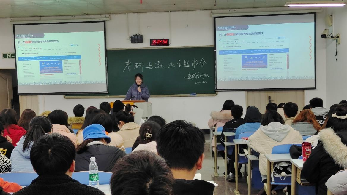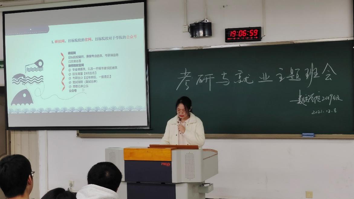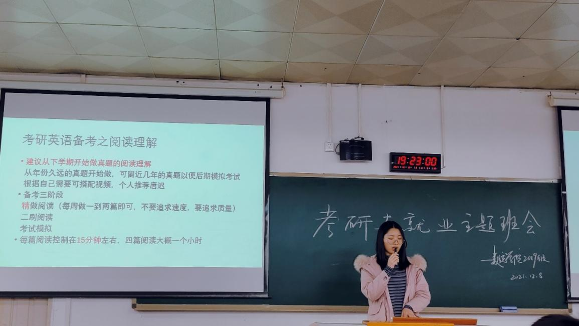 班会伊始,蔡雅西、王倩两位“助理辅导员”就考研院校选择与资料查找做了详细的讲解,给同学们提供了重要参考和指导。紧接着,由蒋蕊、张铭洋、王冬梅、杨静等“助理辅导员”分别对英语、政治、数学,以及专业课等板块从备考、参考书、考研题型等方面与同学们进行了经验交流。从几位“助理辅导员”的交流中,都不约而同指出:考研是一个持久战,需要大家以持之以恒的决心去备考,坚持就是胜利。考研经验分享完后,17、18级三位已工作的学姐给同学们分享了就业体会。他们结合自身实际情况,重点在如何主动出击、如何提高应试能力、如何获取就业信息等方面,为19级同学们做了很详细的讲解。在思想的碰撞和探讨中,主题班会气氛逐渐推向高潮,同学们积极踊跃参与其中,收获良多。