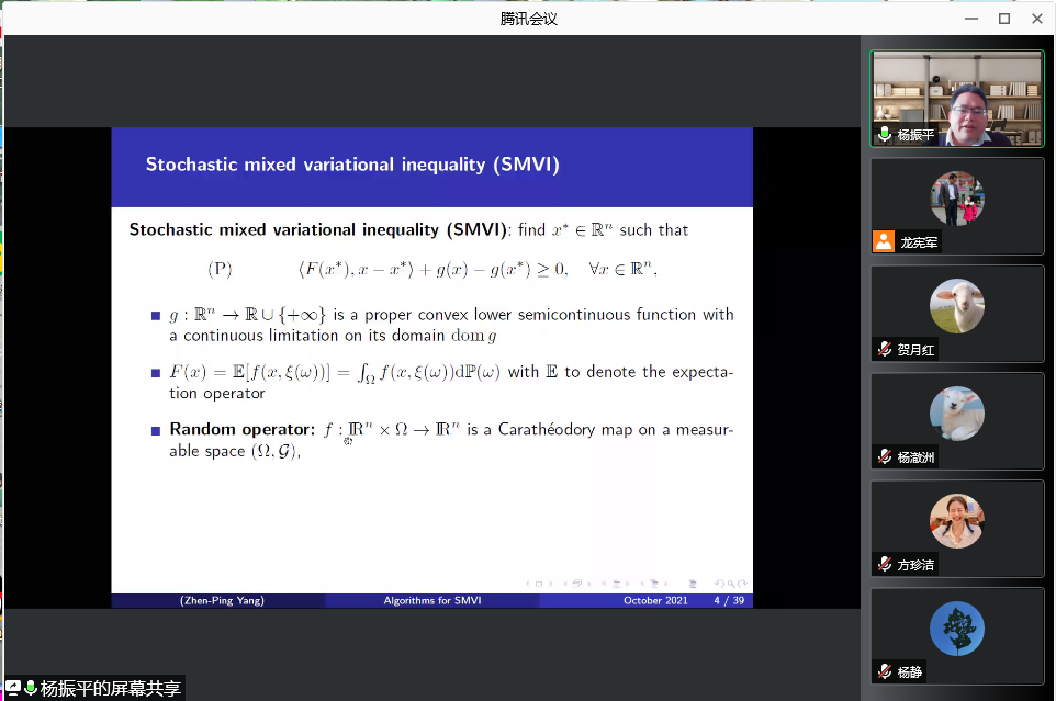 2022年1月14日上午,嘉应公司杨振平副教授为公司师生做了题为《Variance-Based Single-Call Proximal ExtragradientAlgorithms for Stochastic Mixed Variational Inequalities》的线上学术报告。本次报告由公司副经理龙宪军教授主持,孙祥凯、李高西、曾静、李耿华、黄应全等老师以及研究生参加了此次学术报告。