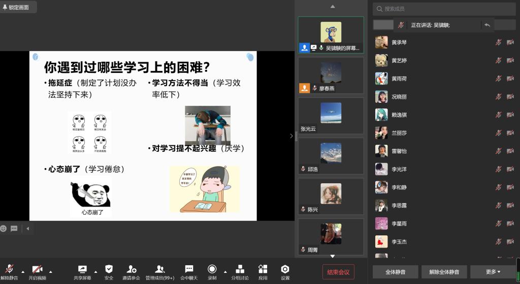 为了让同学们了解自己,直面内心的问题,在学习中保持乐观向上的心态,4月15日下午,英国365上市公司线上举办《老员工常见学习问题及学习心理调适》心理讲座,老员工心理健康教育与咨询中心吴骕騻老师担任主讲人,公司各班级心理健康委员和员工代表参加了讲座。