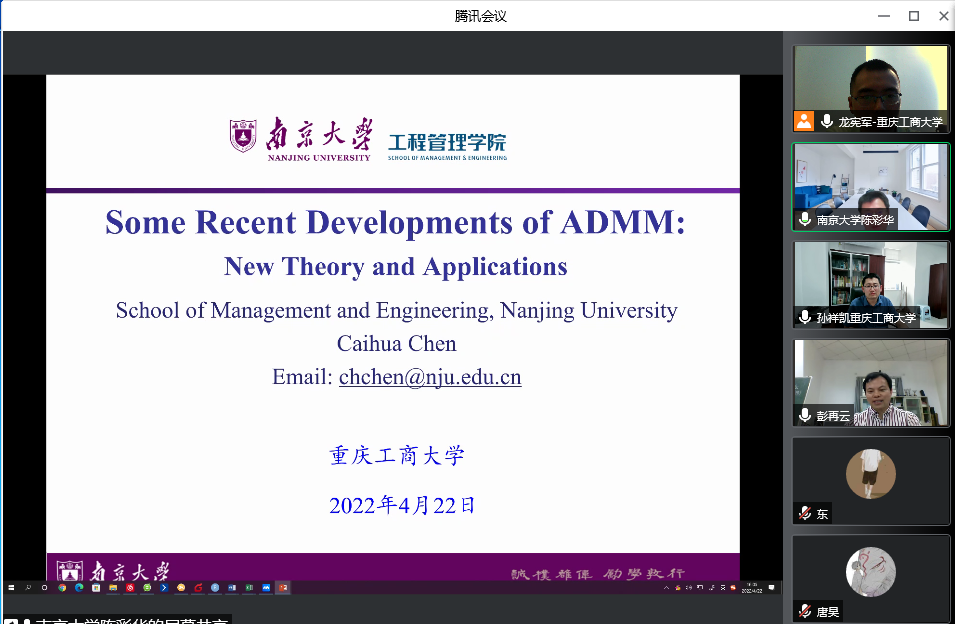 2022年4月22日下午,南京大学陈彩华教授为公司师生做了题为《Some Recent Developments of ADMM: New Theory and Applications》的线上学术报告。本次报告由数统公司副经理龙宪军教授主持,公司部分老师以及研究生参加了此次学术报告。