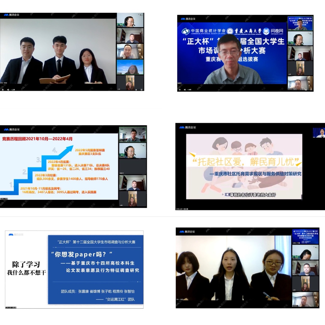 经过激烈角逐,“‘孤’芳自赏,‘独’乐无穷——重庆市孤独经济发展现状及孤独人群消费偏好调查”、“生在当代,利在千秋——三孩政策背景下重庆市适龄女性生育意愿及政策满意度调查”、“托起社区爱,解民育儿忧——重庆市社区托育需求现状与服务供给对策研究”、“探索元宇宙背景下‘剧本杀+旅游’在乡村振兴中的应用前景——以重庆市酉阳县为例”、“请珍惜,你‘看得见’的权力——全国儿童青少年视力问题调查”等5份作品所属团队晋级全国总决赛,赛区另评选出推荐国赛三等奖40项、赛区一等奖26项、二等奖26项、三等奖34项。