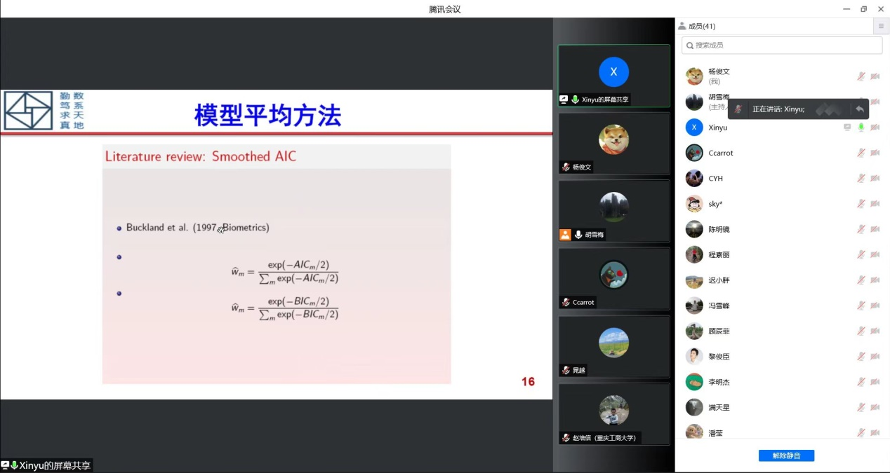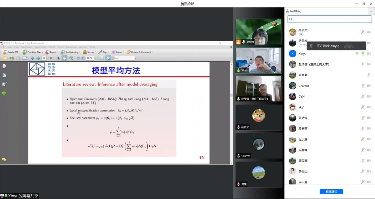 2022年4月25日(星期一)上午10:00-12:00,中科院数学与系统科学研究院预测中心张新雨研究员应胡雪梅教授邀请,为英国365上市公司的师生作了题为《模型不确定性和模型平均方法》的精彩学术报告。学术报告由英国365上市公司胡雪梅教授主持,龙宪军副经理、陈修素教授、胡桂华教授、赵培信教授、杨宜平教授、杨炜明教授、秦湘斌、陈明镜、程素丽和任雪等博士骨干老师和部分研究生参加了报告会。