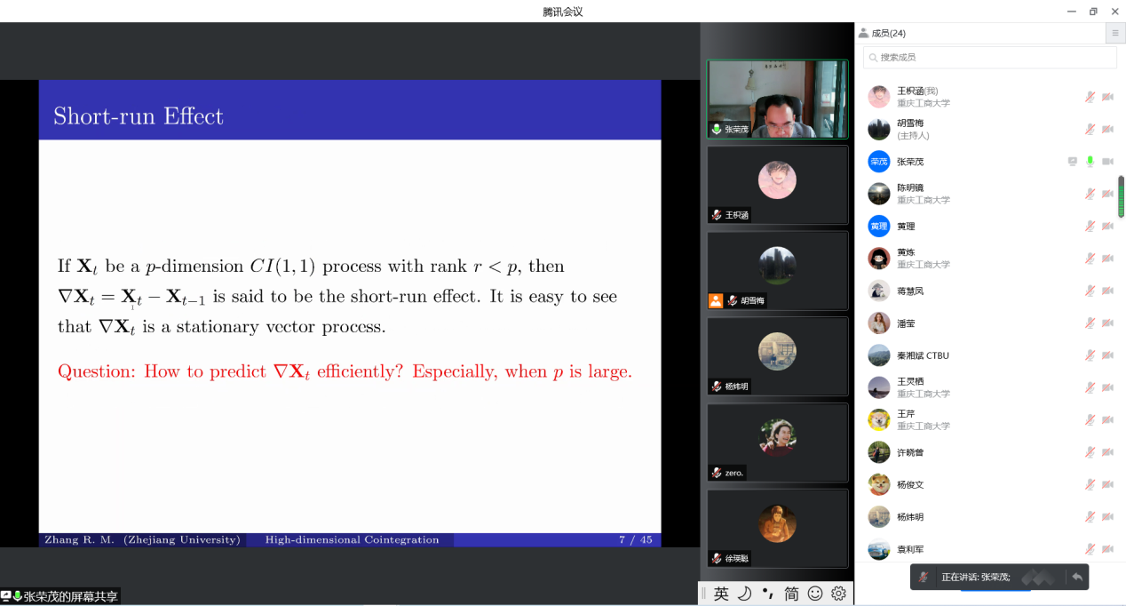 张荣茂教授的报告首先介绍了协整和短期效应的概念,阐述了预测短期效应的三种方法:向量自回归(VAR)、因子模型(FM)和误差修正模型(ECM),重点介绍了他们提出的误差修正因子模型,将长期平稳关系和误差修正模型联合建模,发展了协整空间、协整秩、潜在因子、因子数目等的新估计方法和h步向前预测方法,最后通过两个实例展示了所提方法的有限样本表现。报告结束后公司老师与张荣茂教授在误差修正影子模型、协整秩、Yule-Walker方法估计因子等问题展开了深入交流。