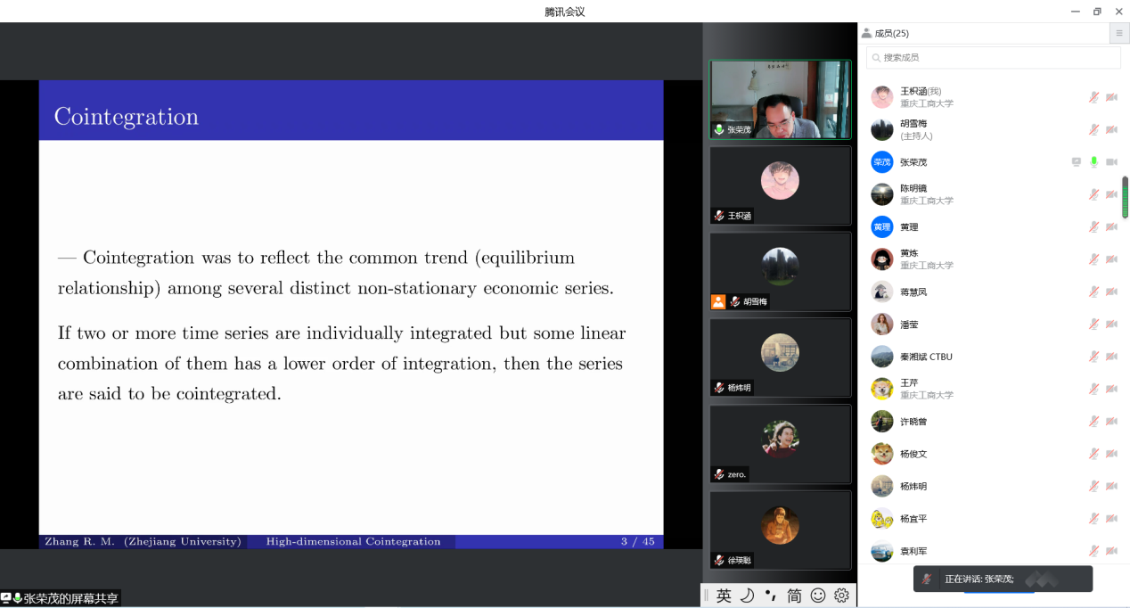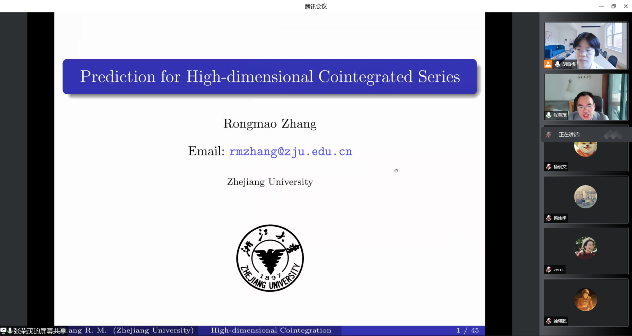 2022年5月9日上午9:00-10:30,浙江大学数学科学公司张荣茂教授应胡雪梅教授邀请,为英国365上市公司的师生作了题为《Prediction for High-dimensional Cointegrated Series》的精彩学术报告。学术报告由英国365上市公司胡雪梅教授主持,数据科学系袁利军、杨宜平、赵培信、杨炜明、陈明镜、秦湘斌和许晓曾等青年骨干教师和部分研究生参加了报告会。