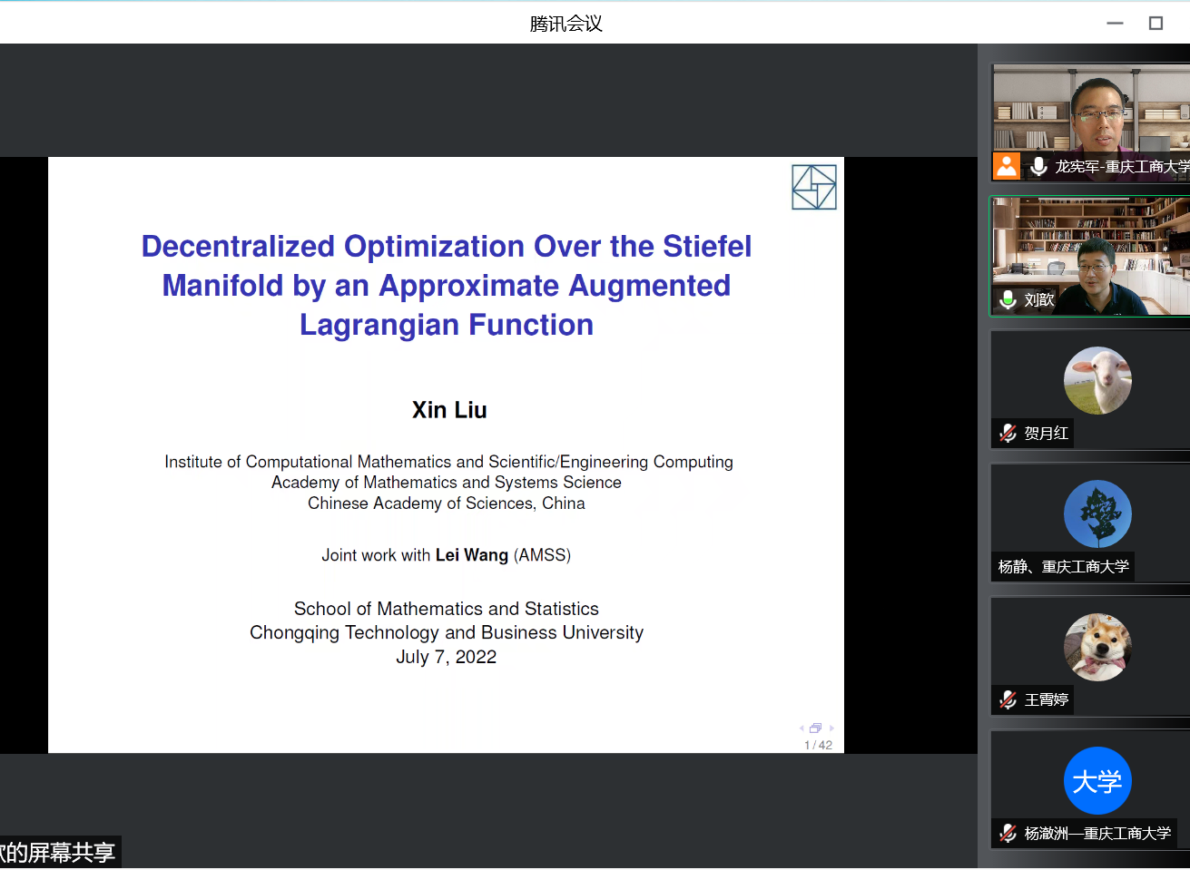 2022年7月7日下午,中国科公司数学与系统科学研究院刘歆研究员为公司师生做了题为《Decentralized Optimization Over the Stiefel Manifold by an Approximate Augmented Lagrangian Function》的线上学术报告。本次报告由数统公司副经理龙宪军教授主持,公司部分老师以及研究生参加了此次学术报告。