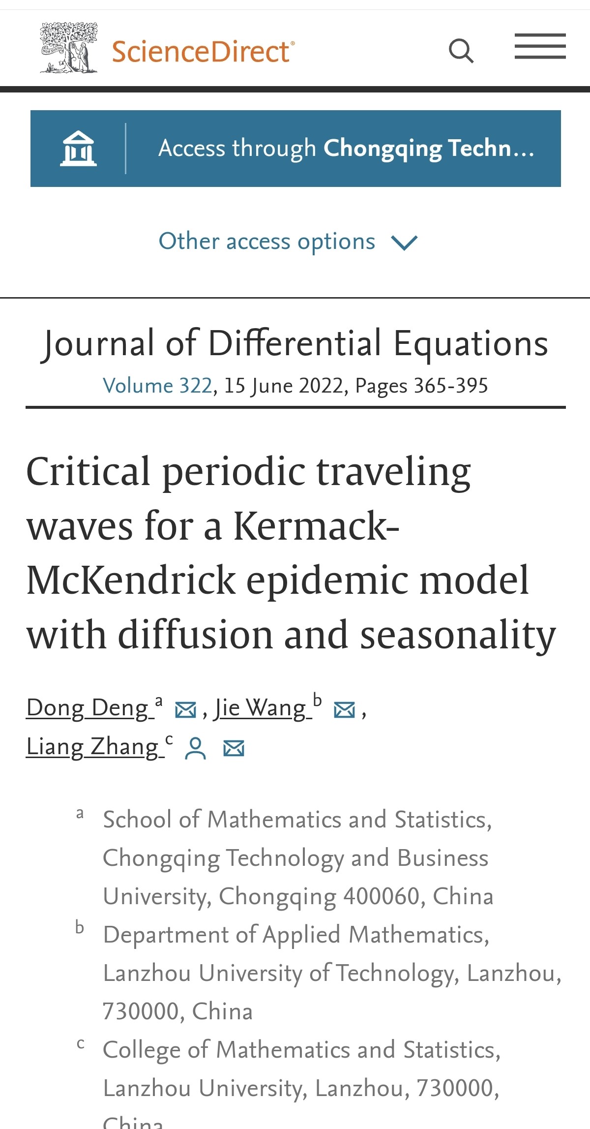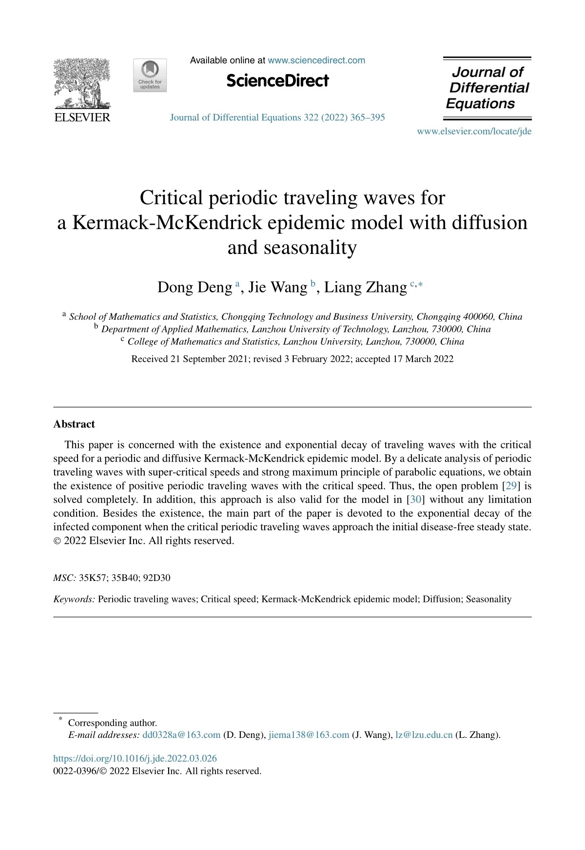 近期,英国365上市公司青年教师邓栋博士题为《Critical periodic traveling waves for a Kermack-McKendrick epidemic model with diffusion and seasonality》的论文在微分方程领域国际权威期刊《Journal of Differential Equations》2022年第322卷正式发表。该论文第一作者为邓栋博士。该期刊是SCI二区TOP期刊,中国数学会认定T2级高质量科技期刊,是微分方程与动力系统领域公认的国际重要期刊。