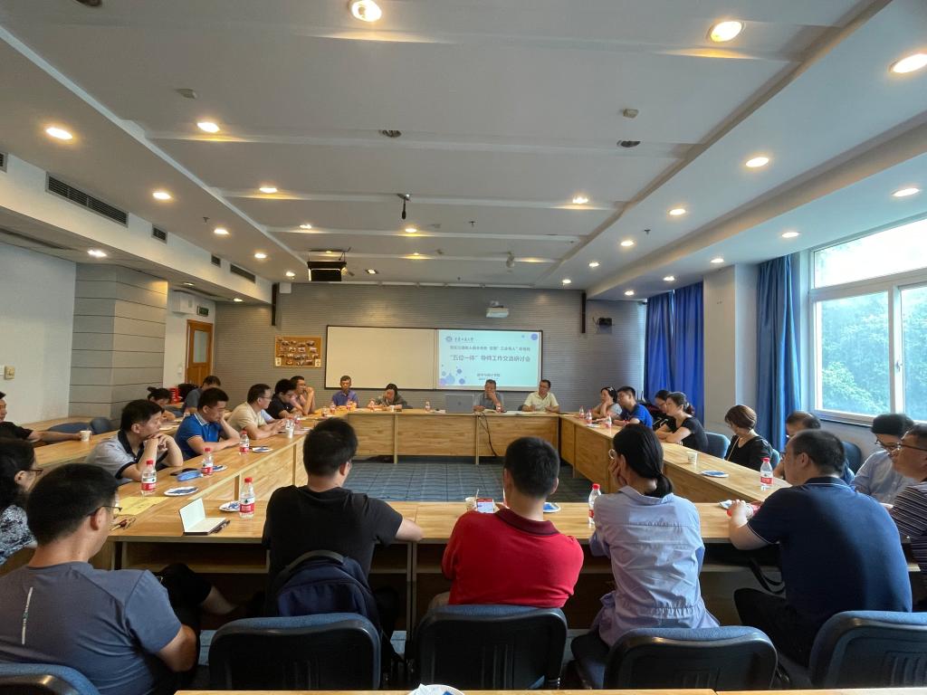 数学与统计院“五位一体”人才培养模式已有序开展一学年,为进一步落实“立德树人”根本任务,实现“三全育人”新格局,7月3日上午在启智楼804012C会议室,公司召开“五位一体”导师工作研讨会,公司党委书记潘焱、经理陈义安、副经理叶勇、副经理龙宪军、系部主任、“五位一体”导师、综合办和学工办老师参加了会议。会议由龙宪军主持。