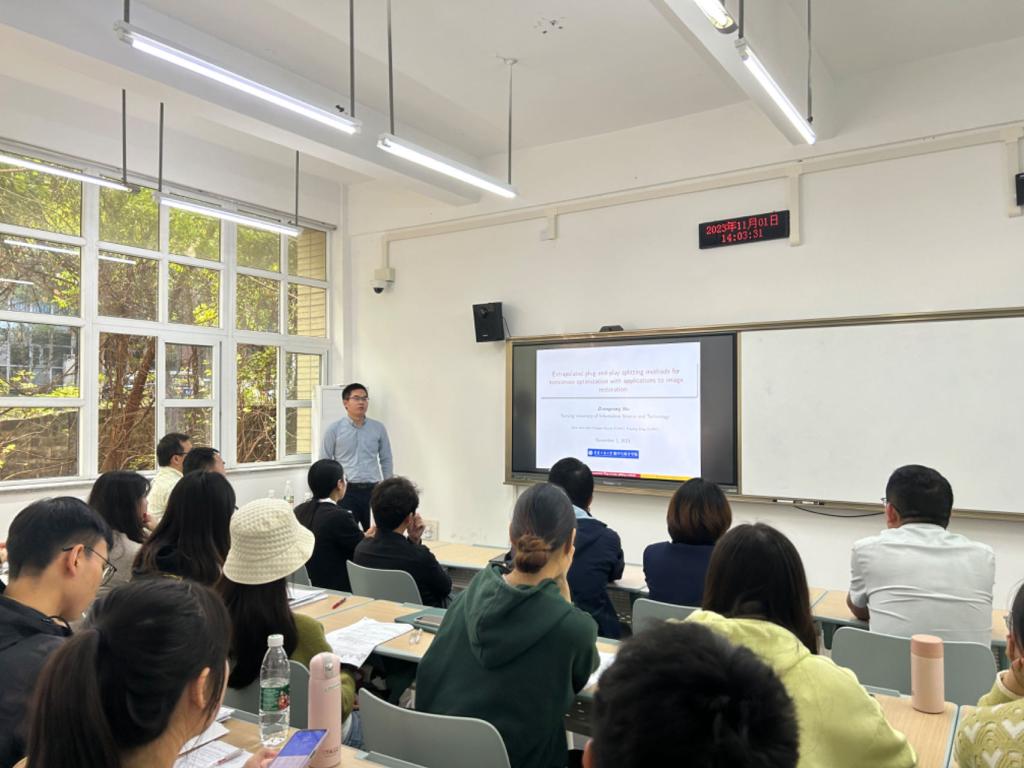 11月1日下午,南京信息工程大学吴中明副教授在明智楼110221教室为公司师生做了题为《Extrapolated plug-and-play splitting methods for nonconvex optimization with applications to image restoration》的学术报告。本次报告由公司副经理龙宪军教授主持,孙祥凯教授、曾静副教授、李高西副教授、李耿华副教授、黄应全老师、黄拉博士以及运筹学与控制论专业的全体研究生参加了此次学术报告。