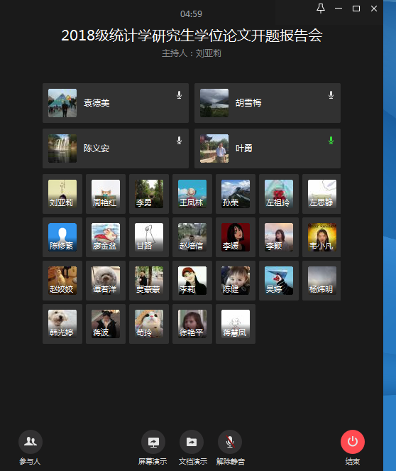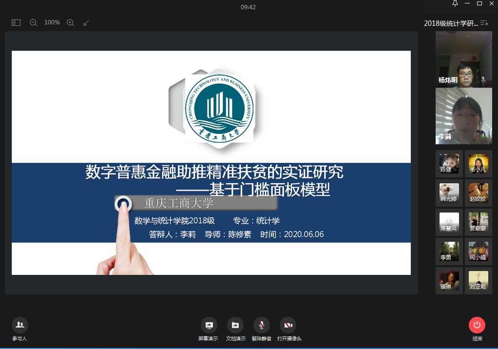 为做好公司2018级统计学专业研究生学位论文工作,加强学位论文的过程管理,切实提高学位论文的质量,公司于2020年6月6日下午14:00,在企业微信进行了2018级统计学专业研究生开题报告会。