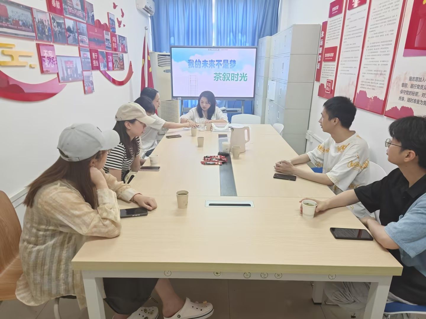 茶叙中,在话题聚焦到未来职场发展的时候,两位老师结合自身学习工作经历和已毕业员工的成功案例,与同学们围绕未来发展规划展开讨论。最后刘亚莉对员工们提出了殷切的希望:一是希望同学们要增强就业紧迫感,树立“先就业、再择业”的就业观念,敢于抓住机遇;二是希望同学们认真总结求职经验,积极反思,面对困难时要迎难而上;三是希望同学们找准定位,主动出击,树立基层服务意识。