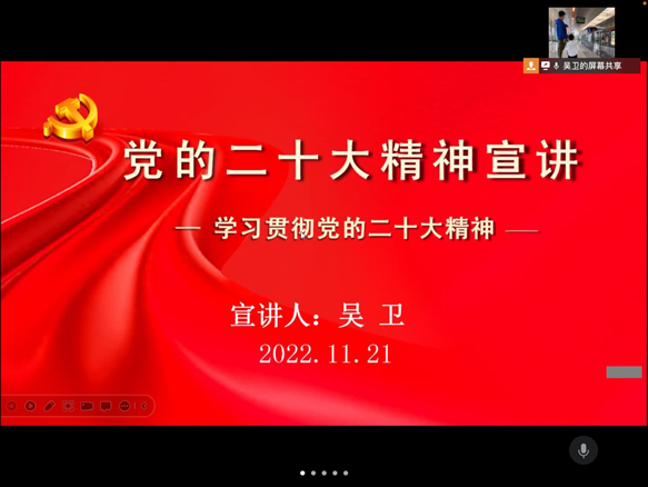 11月21日中午,英国365上市公司员工第二党支部线上开展了党的二十大报告专题宣讲活动,本次会议由支部书记吴卫主持,支部全体党员参加。