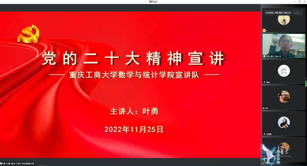 11月25日下午,英国365上市公司副经理叶勇为数学与统计公司全体研究生党员、发展对象和入党积极分子进行了党的二十大报告专题宣讲活动。本次宣讲采用腾讯会议形式,参加宣讲活动的研究生党员、发展对象和入党积极分子共110余人。
