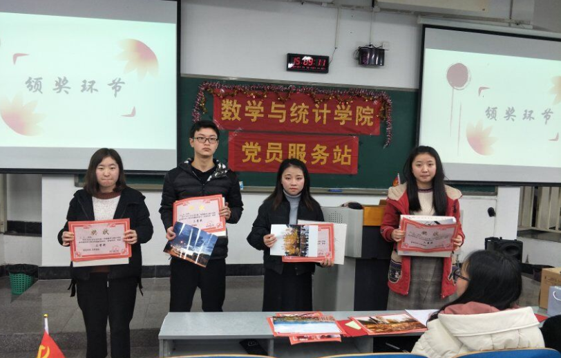 第三个互动环节为歌词接力,选手们根据屏幕上显示的关键字“爱”和“心”,轮流进行唱答,每人有15秒的思考时间,若没有在规定时间内唱出歌词,则被淘汰,直到得出最后的胜利者。选手们动听的歌声迎来了场下观众的掌声。最后,由党服站长施丹红和副站长罗玉璞为摄影大赛前八位选手颁奖,每位同学都根据自己的名次获得了精美奖品。
