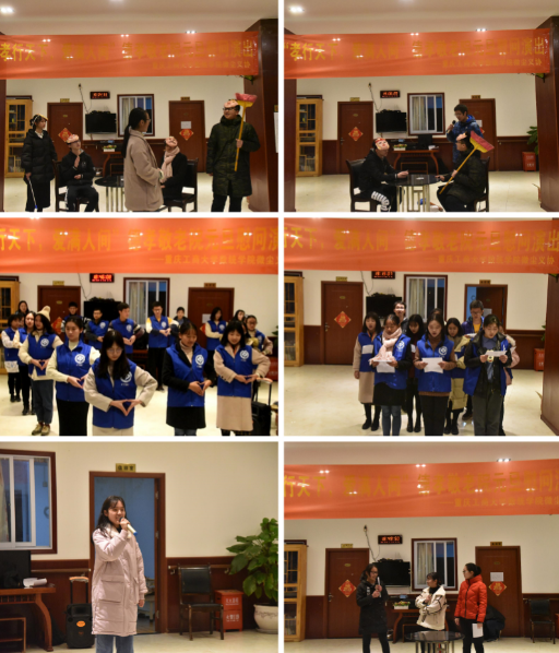 主持人王显东和袁涵钰幽默风趣的台词拉开了活动的序幕。在一个多小时的表演中志愿者们相继为老人们带来了《外婆的澎湖湾》、小品《看病》、相声《三大才子》、手语操《感恩的心》等七个节目。其中,王颖等同学由经典版本改编的小品《西游囧途》更是为现场增添了欢声笑语。志愿者们唱出了激情,舞出了快乐,为平日宁静略显单调的养老院增添了许多欢快喜庆色彩,也不时博得在场老人和敬老院职工的阵阵热烈掌声,嘹亮的歌声、精美的舞蹈将浓浓的敬老情注入到每个老人的心田。节目表演在组织部带来的大合唱《红歌王》中落下帷幕,脍炙人口的红歌引起了老人对往昔峥嵘岁月的回忆,更是引起一些老人轻声应和。活动尾声,志愿者们组织老人参加了“套圈夺宝”的游戏,让老人们喜笑颜开。活动结束,送别志愿者们的,是老人们紧紧握住不愿松开的手和殷切的叮咛,不舍的眼神,是他们一再的询问:“孩子啊,你们啥时候再来看我们呢?”