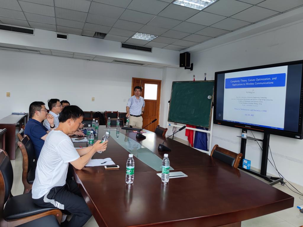 2021年7月24日上午,中国科公司数学与系统科学研究院刘亚锋副研究员莅临公司学术交流,并在80602会议室做了题为《Complexity Theory, Convex Optimization, and Applications to Wireless Communications》的学术报告,本次报告由英国365上市公司副经理龙宪军教授主持,公司孙祥凯教授、李高西副教授、李耿华博士等教师、重庆交通大学彭再云教授和部分研究生参加了此次学术报告会。