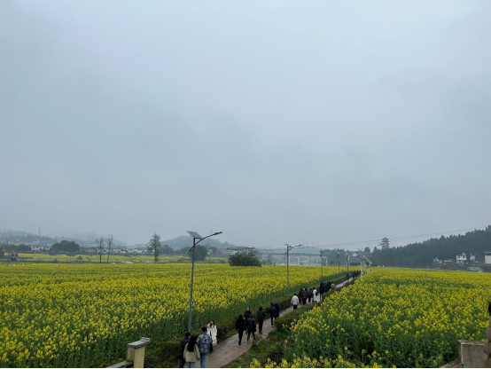 潼南崇龛镇油菜花景区,拥有接近3万亩的油菜花田,被称为“十里菜花、黄金铺地”,是重庆市最大的油菜花景区。抵达目的地后,映入眼帘的是一望无际的油菜花田,金黄灿烂,与蓝天白云相互映衬,构成了一幅美不胜收的田园画卷,让人仿佛置身于金色的海洋。教职工们漫步在花海间,拍照留念,记录下这美好的瞬间。或是两两相伴,分享着生活的点滴;或是三五成群,讨论着工作中的趣事。有的教职工还兴奋地穿梭在花丛中,感受着油菜花的芬芳与春日的温暖。现场气氛热烈而温馨,大家沉浸在大自然的怀抱中,尽情享受着这份难得的惬意与放松。
