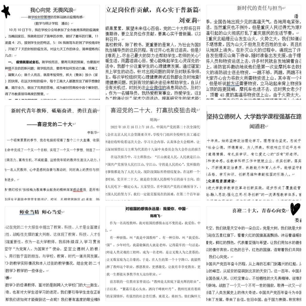 此次活动,获得了数统公司教职工积极参加。其中,有78位教职工参加了朗读比赛,他们用最走心的声音,表达对党的深爱,对祖国的热爱,对即将到来的二十大的期待;有71位教职工参加了征文活动,他们用最质朴真诚的文字,向祖国母亲和党表白,或分享教学工作经验,或抒发教师们教书育人、奋发有为的进取精神。这些朗读和征文作品充分展现了数统公司教职工们爱教育、爱生活、爱家爱党的丰富精神面貌。