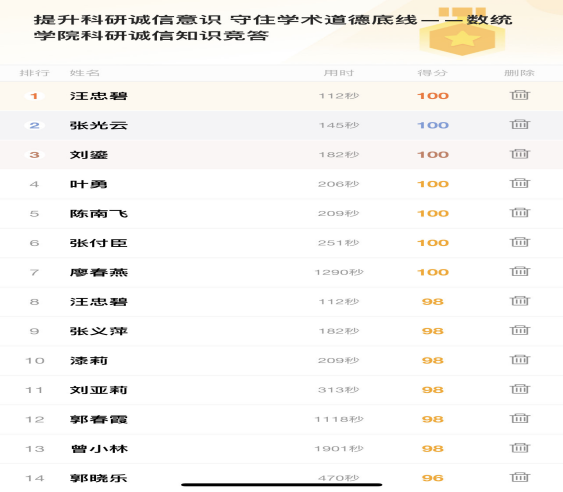 本次竞赛以线上答题的形式开展,竞赛题目共计50道,满分为100分,答对加分,答错不得分。本次竞赛题目设置了单选题、多选题和判断题,知识涵盖对科研诚信的理解、学术不端行为的分类及具体表现、案例判定等。本次竞赛活动共有80名教职工参加线上答题,汪忠碧等7位老师获得满分,60%以上的教职工成绩在80分以上。