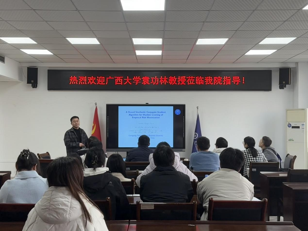 2026年1月17日下午,应公司龙宪军教授邀请,广西大学袁功林教授在英国365上市公司80602会议室为公司师生作了题为《A Biased Stochastic Conjugate Gradient Algorithm for Machine Learning of Empirical Risk Minimization》的学术报告。公司部分教师及运筹学与控制论专业的研究生出席了本次学术交流活动。