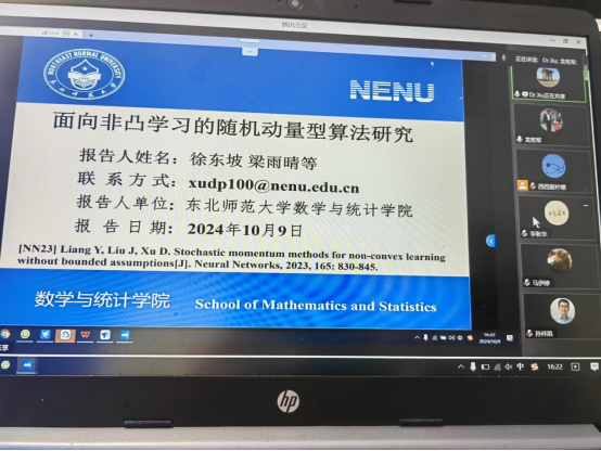 10月9日下午,东北师范大学徐东坡教授在线上为公司师生作题为《Stochastic Accelerated Gradient Algorithms for Large-Scale Machine Learning》的学术报告。公司副经理龙宪军教授主持,孙祥凯教授、李高西副教授、李耿华副教授、黄拉博士以及运筹学与控制论专业的全体研究生参加了此次学术报告。