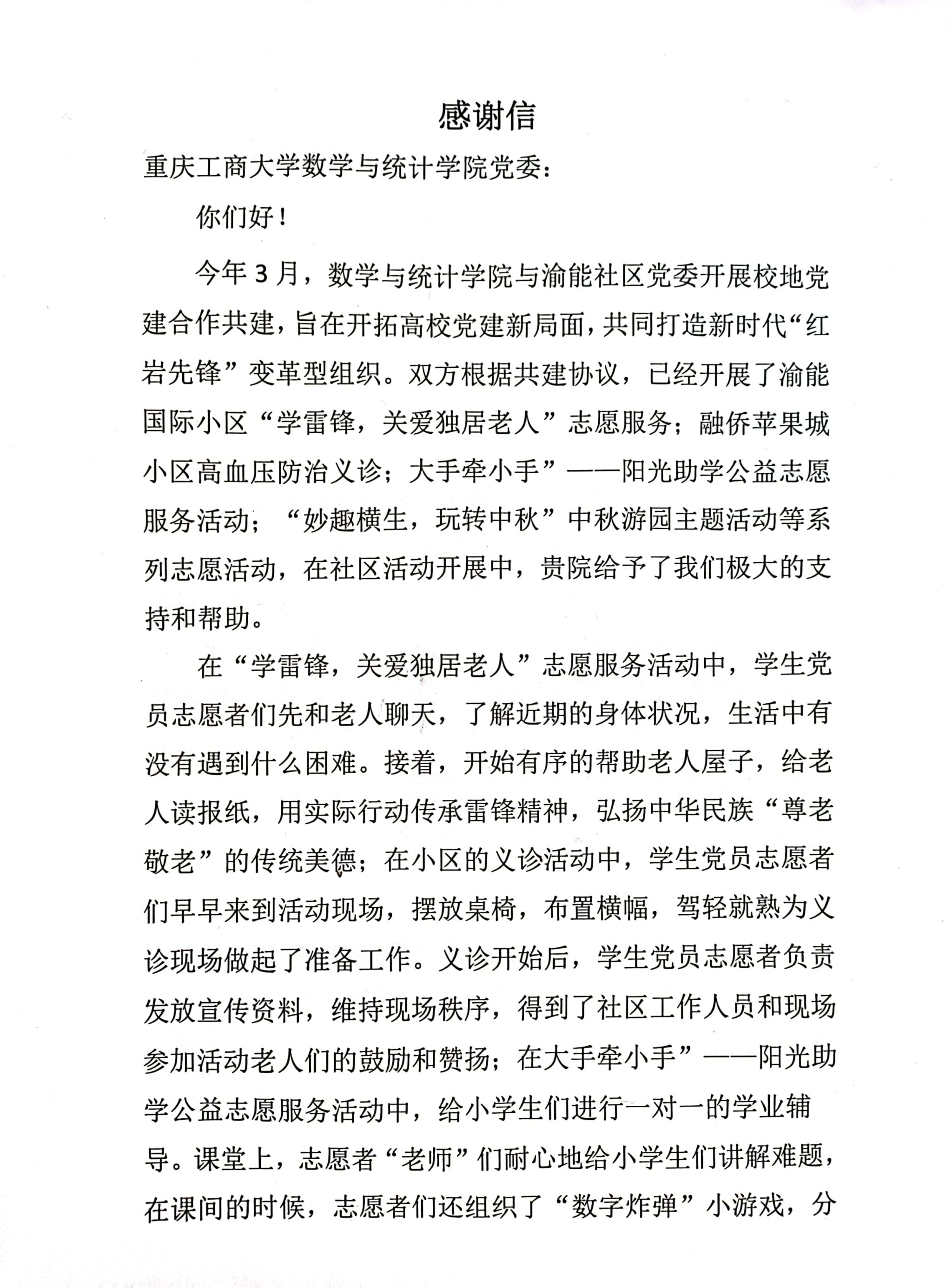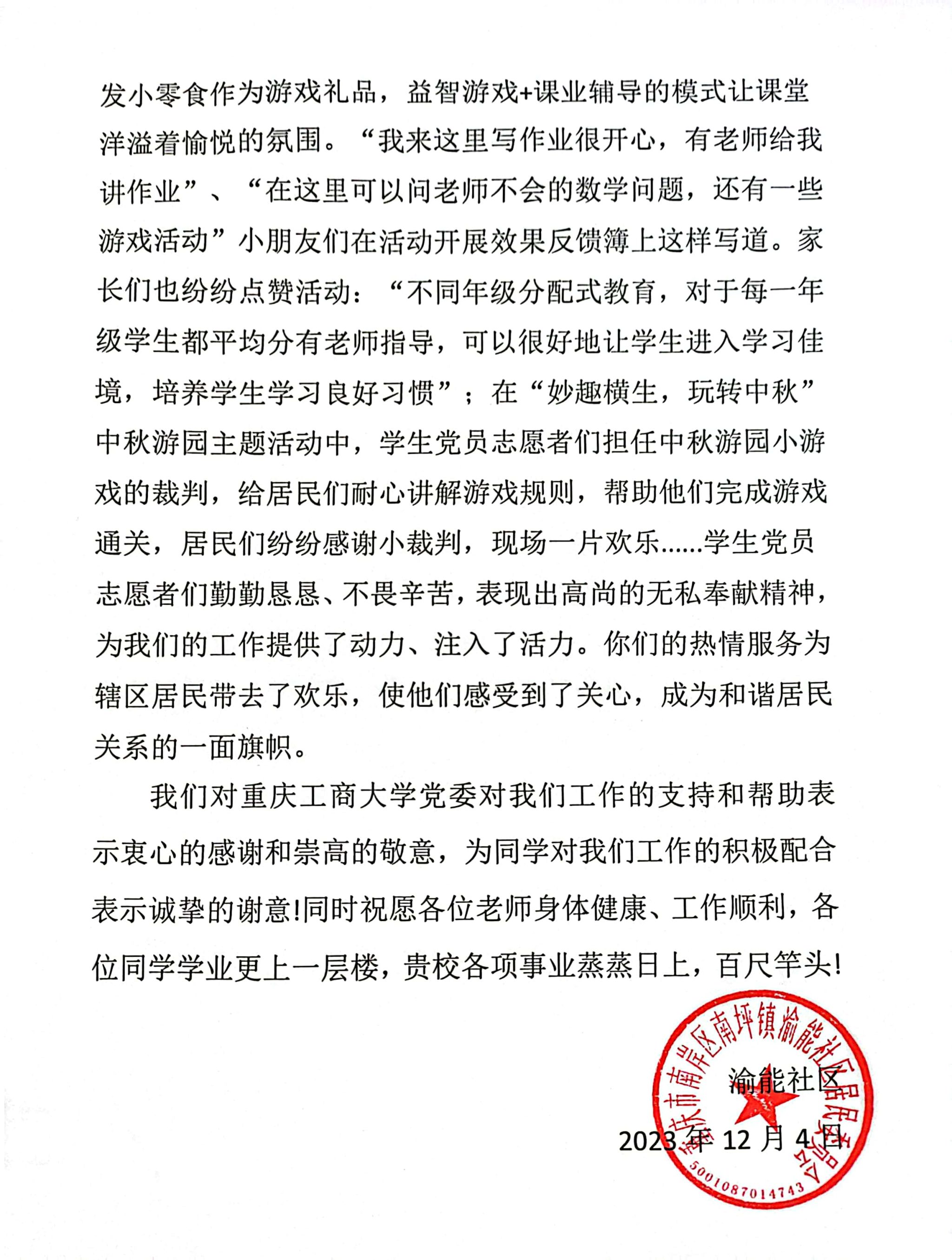 近日,公司党委收到一封来自南岸区南坪镇渝能社区党委的长达两页的感谢信,对公司党委积极开展双方党建共建,组织师生党员长期服务社区表示感谢。